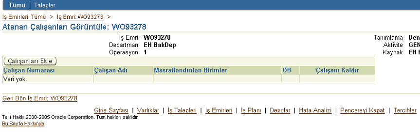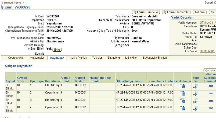 Detayları görüntülemek için ilgili iş emri numarasının üstüne tıklanır. Kaynaklar tabından ilgili operasyonlar için çalışan kaynakları eklenir.