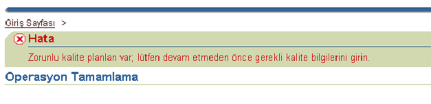 Bu aşamada direk uygula butonuna basarsak aşağıdaki kalite planı hatası alınır.
