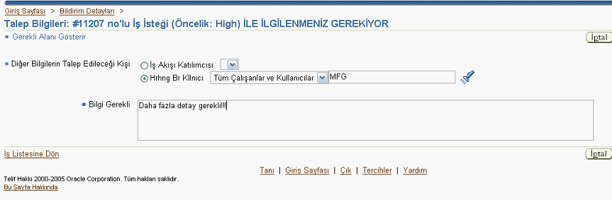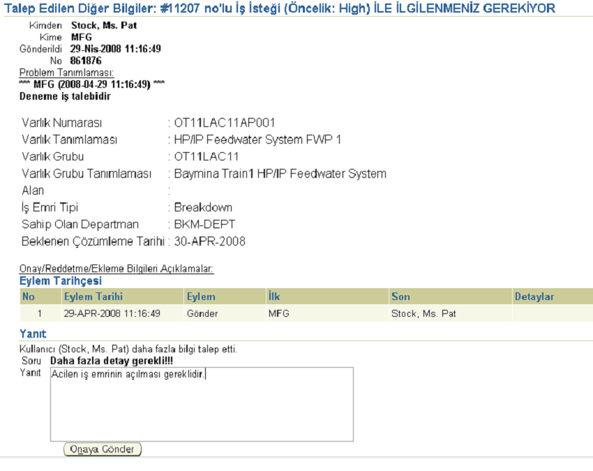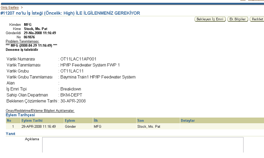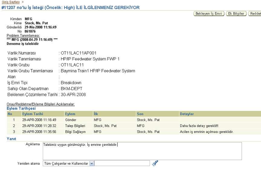 Bu aşamadan sonra yönetici dilerse tekrar detay bilgi isteyebilir. Ek bilgi ekleyebilir. Reddedebilir yada iş talebini bekleyen iş emrine çevirebilir.