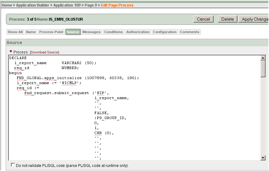 Source kısmına yazdığımız kod eklenir. Burda önemli olan fnd_global.apps_initialize parametrelerini vermeniz. :p9_group_id nedir diyenlere. WIP arayüzüne yazarken bunu sequence’den otomatik aldırıyoruz. Sonrada prosedürümüze dahil ediyoruz ki hangi sıradaki kayıtları alacağını bilsin.