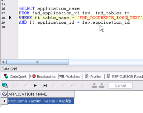 [sql]SELECT application_name FROM fnd_application_vl fav, fnd_tables ft WHERE ft.table_name =‘FND_DOCUMENTS_LONG_TEXT’ AND ft.application_id = fav.application_id[/sql]